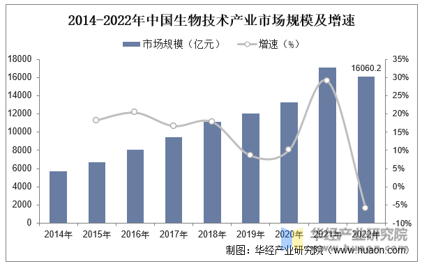 生物手艺行业是一个涵盖了生物医药、基因测序、生物试剂和手艺办事等多个细分范畴的普遍财产。正在新冠疫情的影响下,和企业加大了对疫苗、药物和检测设备等相关产物的研发投入。同时,跟着生齿老龄化、居平易近保健认识加强、医疗卫生收入添加等要素,对生命科学范畴的立异产物和办事也有更大的需求。中国生物手艺行业正在近年来取得了快速成长,2022年中国生物手艺财产市场规模达到1。6万亿元,2014至2022年期间CAGR为13。87%。